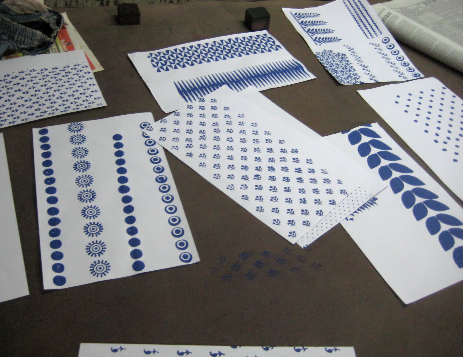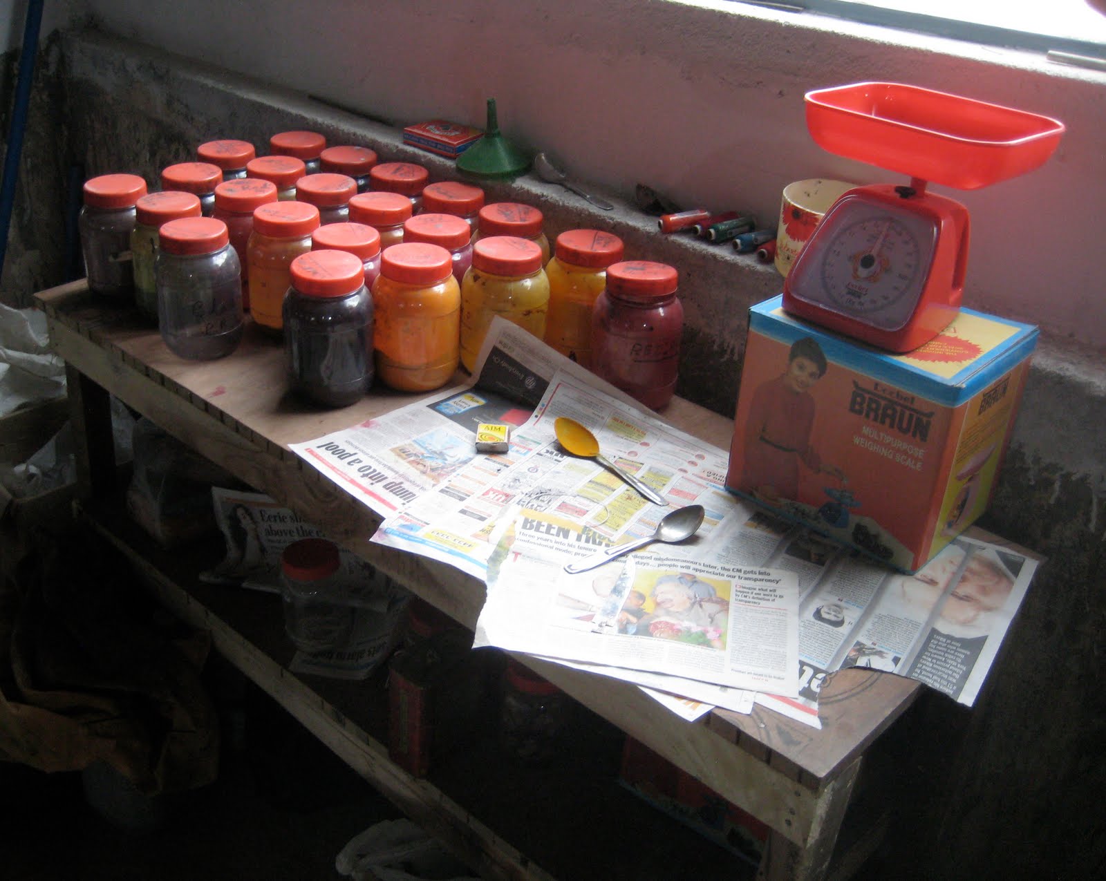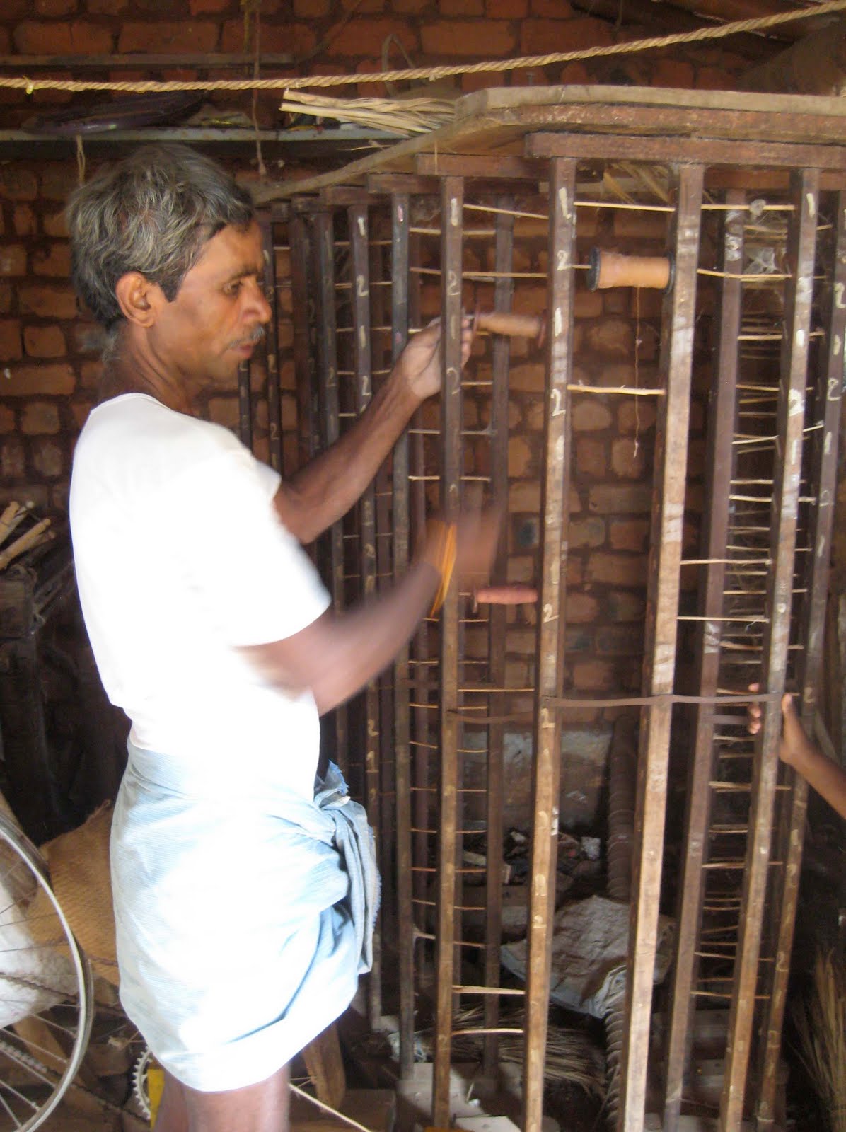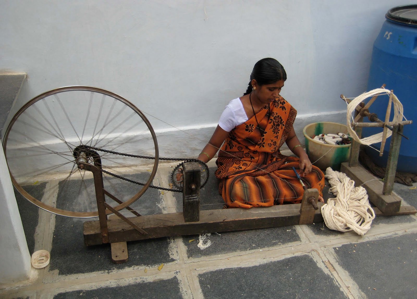 the weavers in this village get spun and dyed yarns from other neighboring points. women do the job of unwinding the skeins of yarn onto spools, using spinning wheels made from old bicycle wheels.