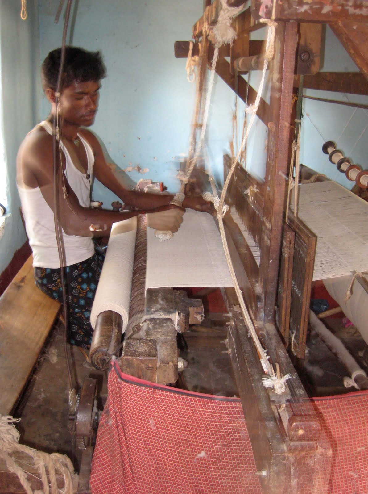 the rope in the weaver's hand is pulled to throw the shuttle from side to side in an amazingly rhythmic and musical way, happening so fast it is hard to see the shuttle flying. the yarn on the spools strung behind the sheds are used to repair broken warp threads.