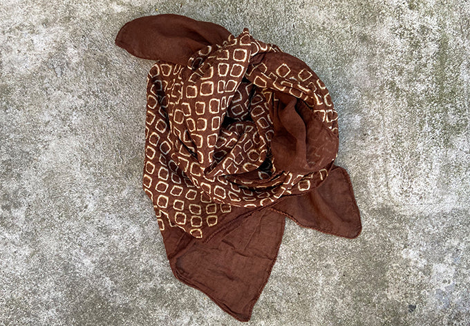 this whisper-light scarf is tied, hand dyed a warm shade of brown,