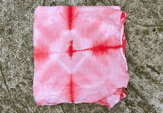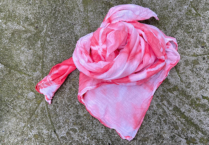 this whisper-light scarf is clamp dyed in a coral pink; darker and lighter in areas