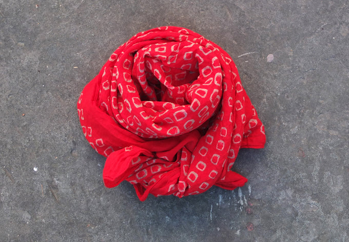 this whisper-light scarf is tied, hand dyed a deep shade of red,