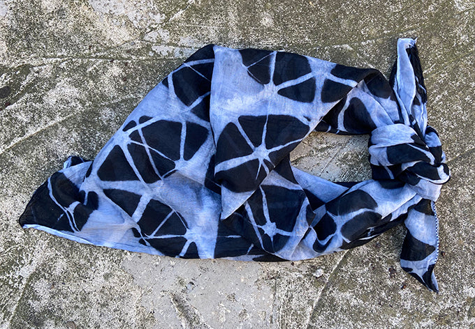 this whisper-light scarf is clamp dyed in shades of grey and black