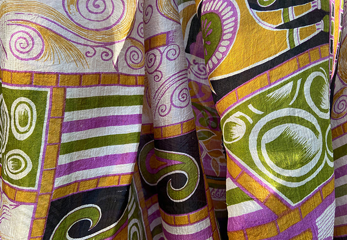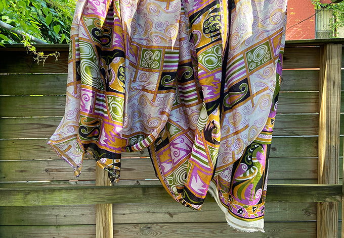 bold graphic pattern in black, gold, olive, and violet on off-white