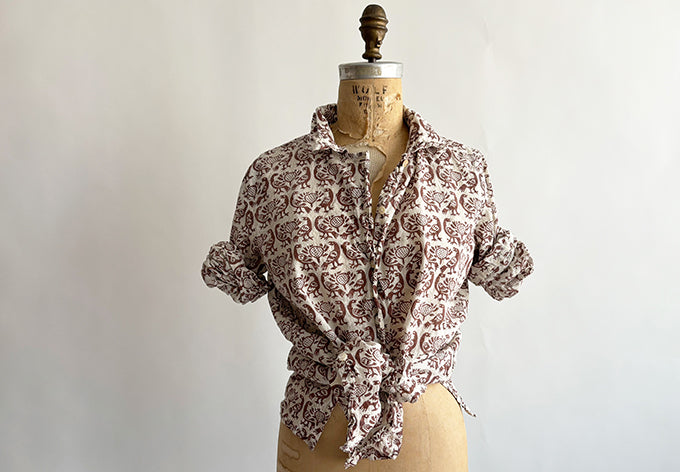 classic cut shirt has silver zari topstitching, mother of pearl buttons