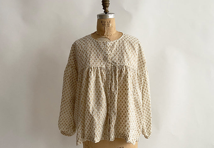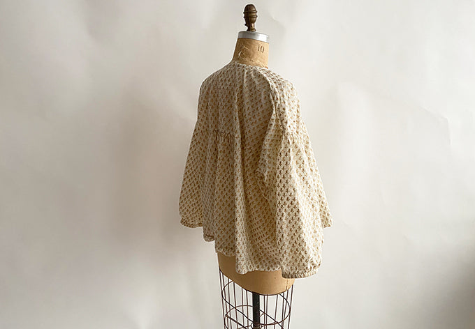 https://admin.shopify.com/store/auntie-oti/products?query=puffy%20blousejewel neck, yoke with gathers front and back, shell buttons on front placket, slight gathering at shoulder and loose elastic on sleeves