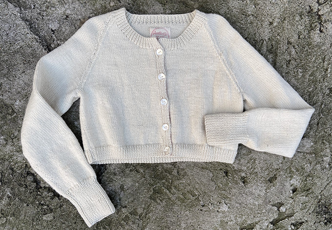 full fashioned raglan sleeves, extra long rib cuffs, seamless neckline finishing, grosgrain ribbon trim at inner front edges, shell buttons