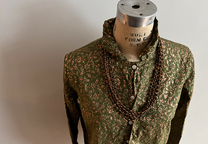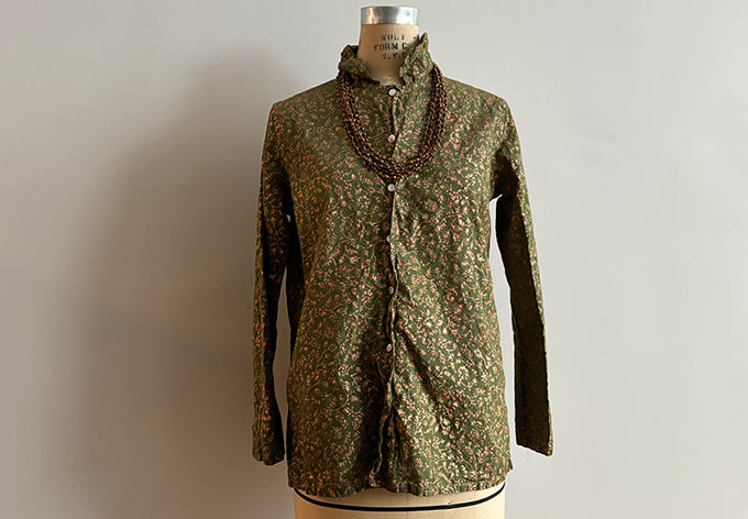 classic cut shirt has gold zari topstitching, mother of pearl buttons