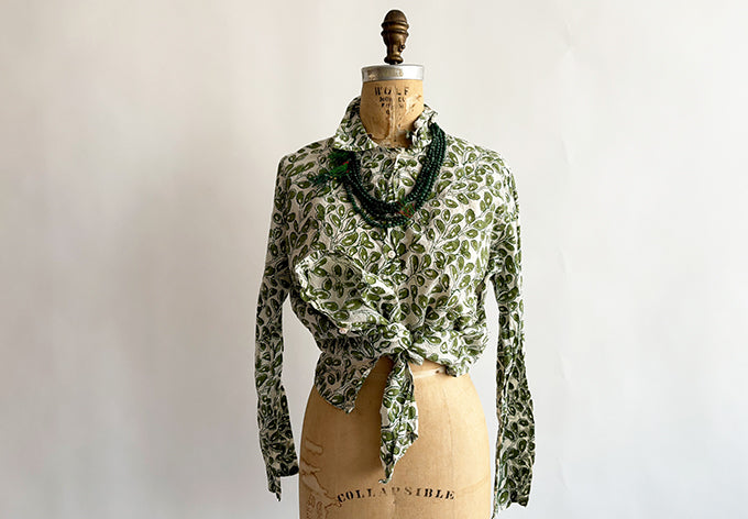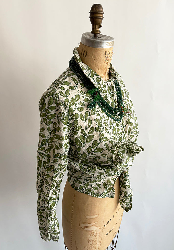 classic cut shirt has silver zari topstitching, mother of pearl buttons