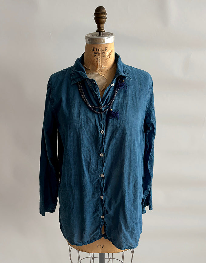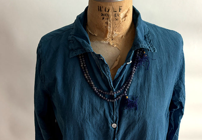 classic cut shirt is natural indigo dyed with silver zari topstitching, mother of pearl buttons