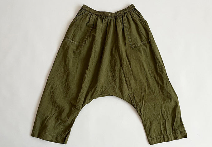 drop crotch and easy fit with cropped length; elastic waistband, front patch pockets