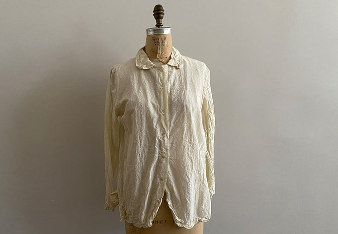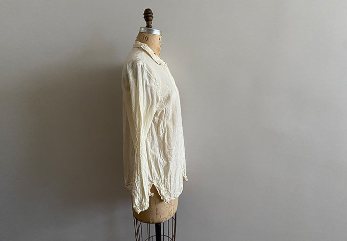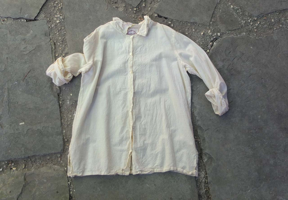 classic cut shirt is made of unbleached cotton with gold zari topstitching; shell buttons