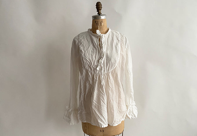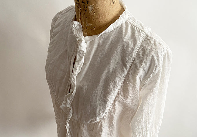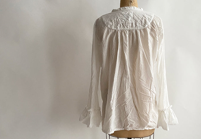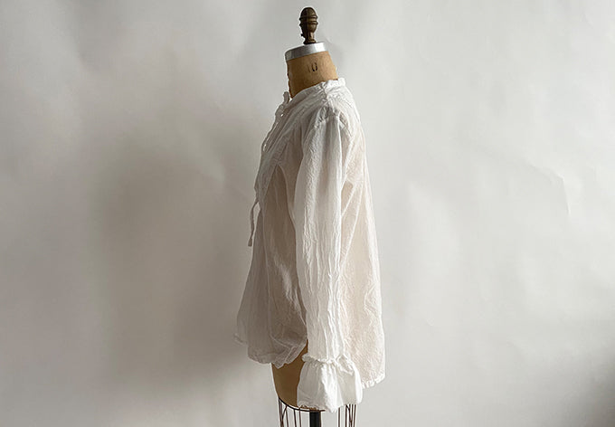 bib front with shell buttons, neckline finished with skinny tie, shirttail hem, raw edge double layer ruffled cuffs