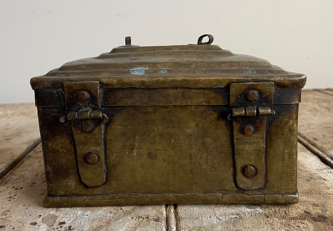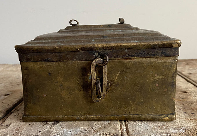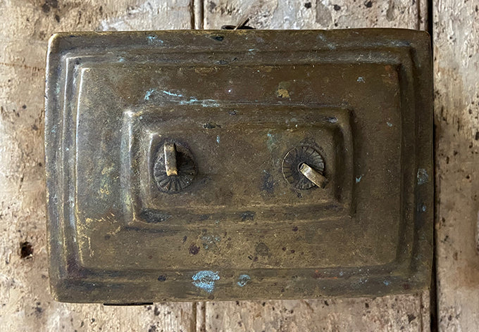 from the stepped edges on the lid to the hinges and unusual latch shape