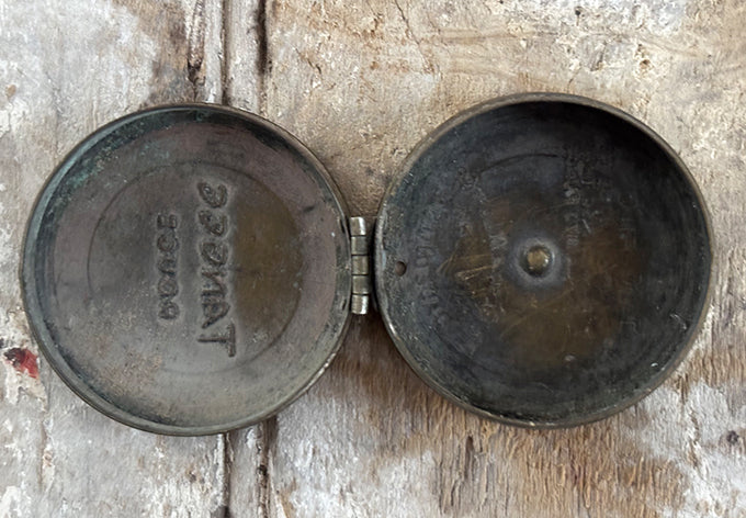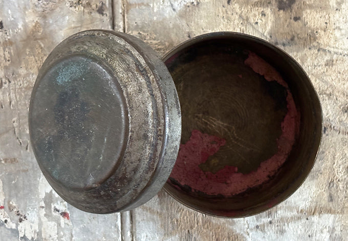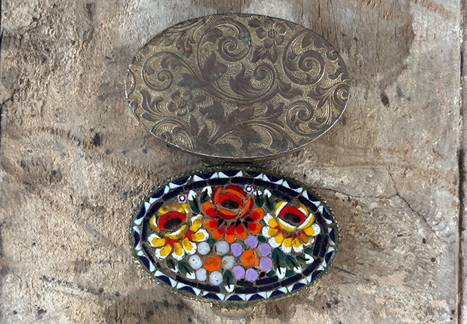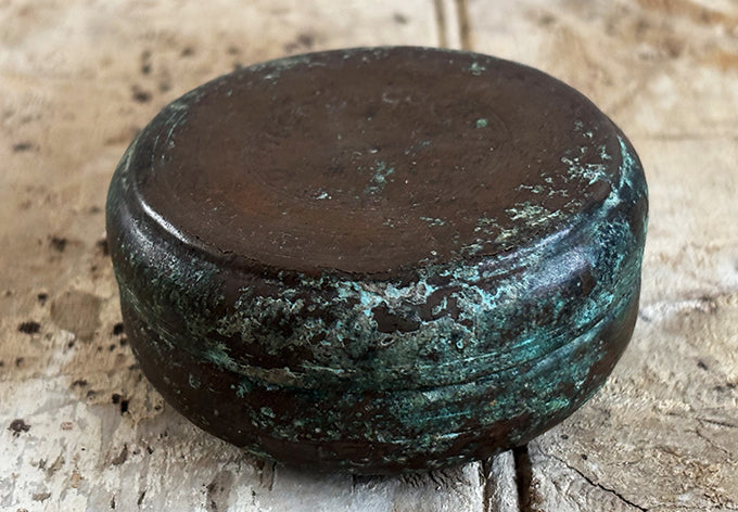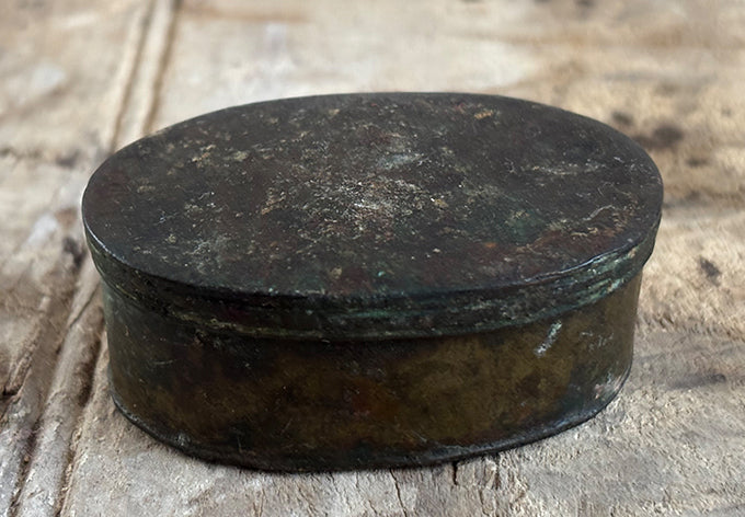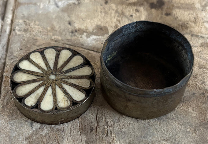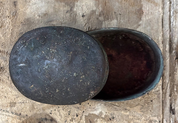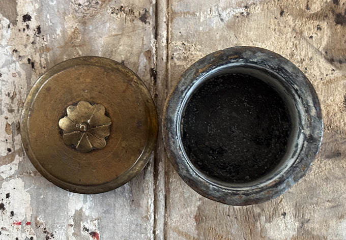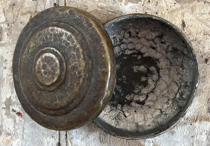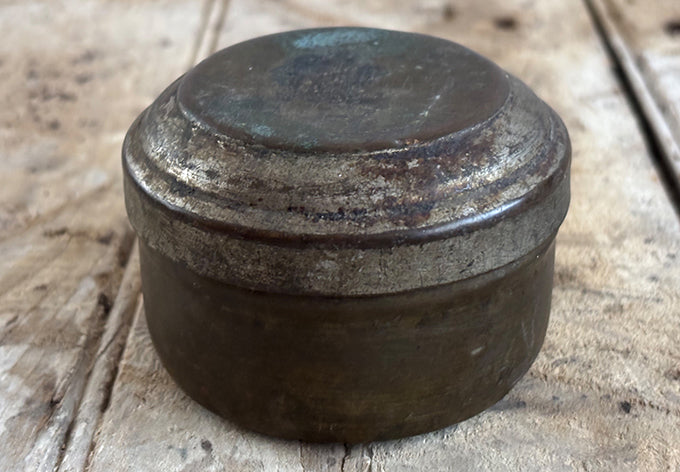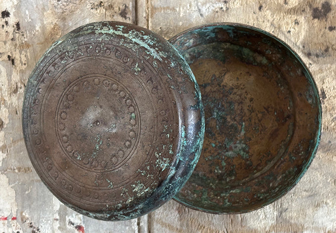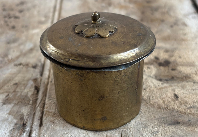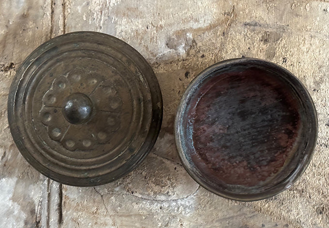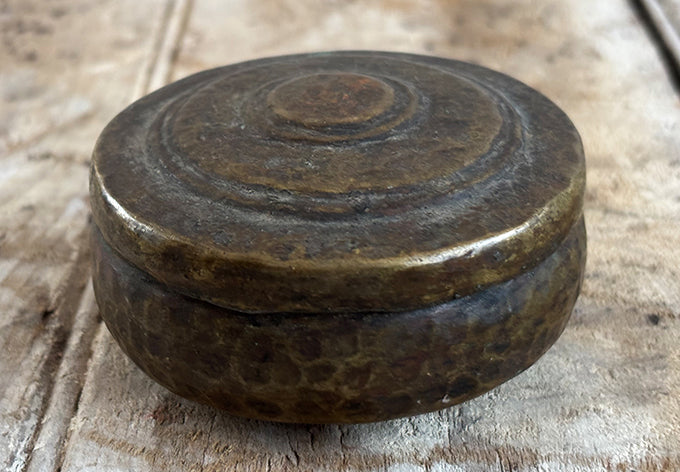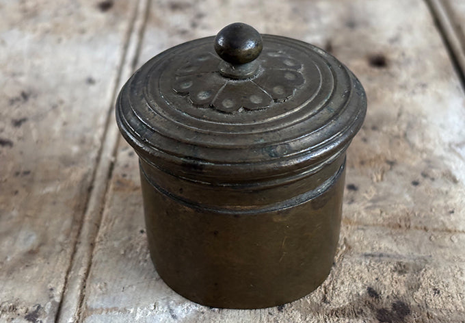 array of brass lidded containers, origins unknown
