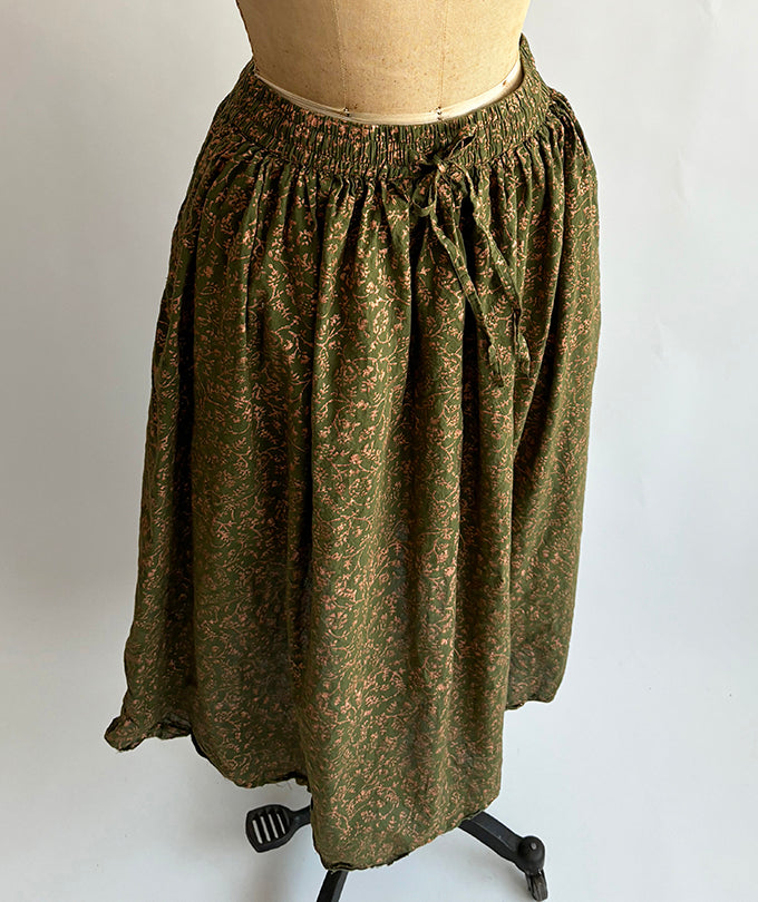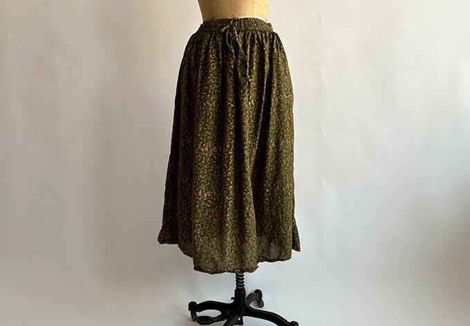 double elastic waist with adjustable drawsting, raw edge hem, on seam pockets, mid calf length