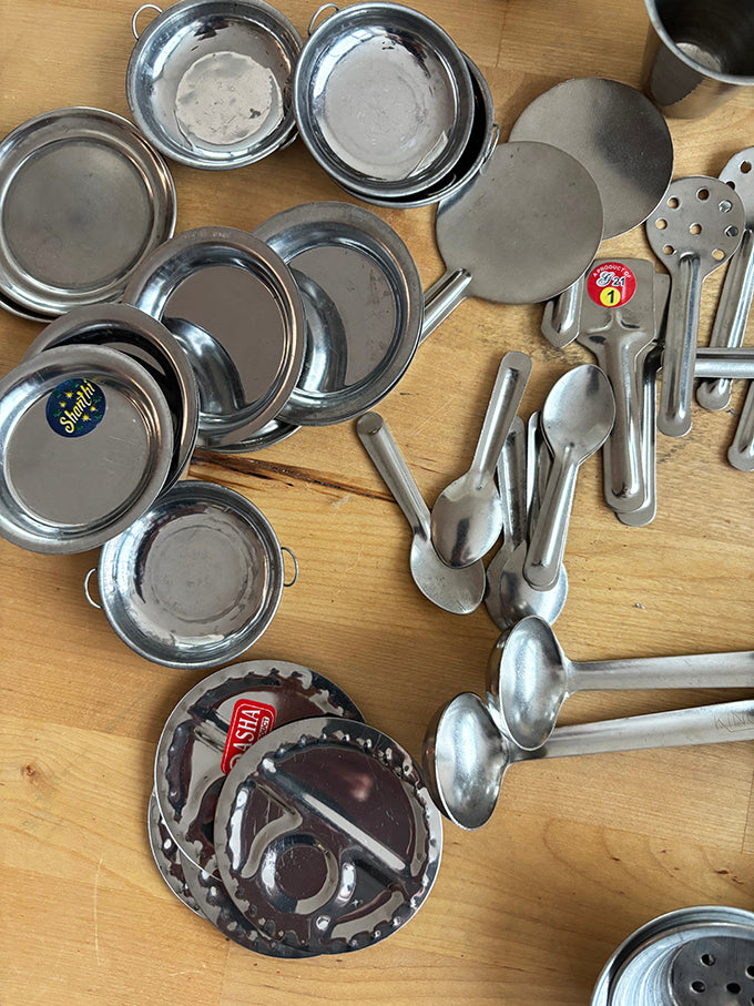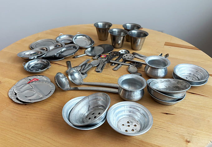 play Indian kitchen with this set of plates, thalis, ladles, spoons, strainers, woks, tumblers, and other miniature kitchen essentials