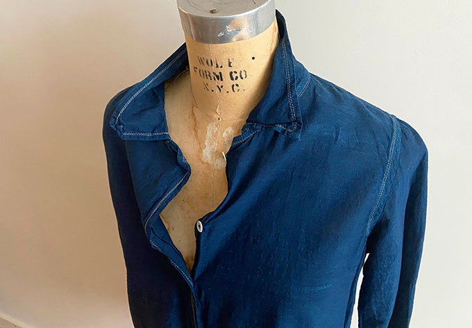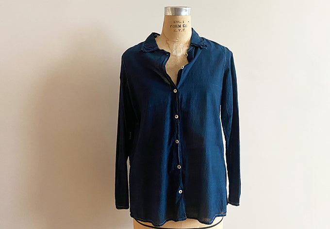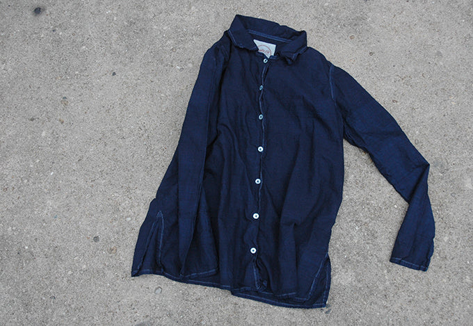 classic cut shirt is natural indigo dyed with silver zari topstitching, mother of pearl buttons