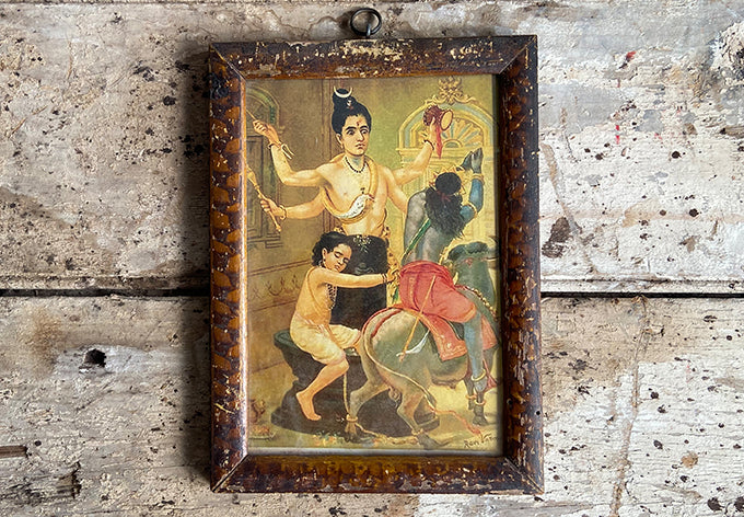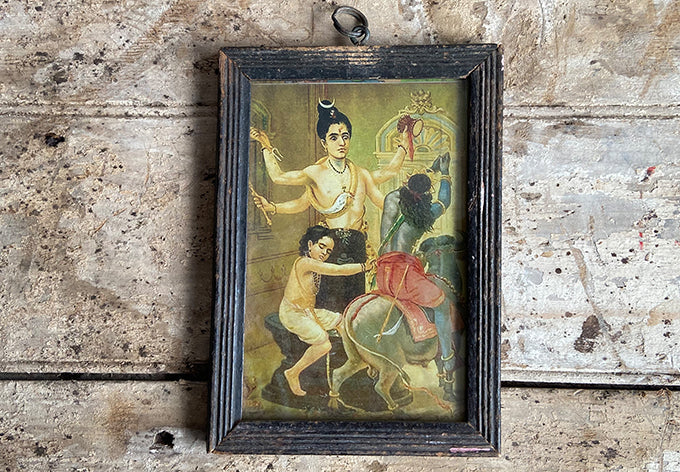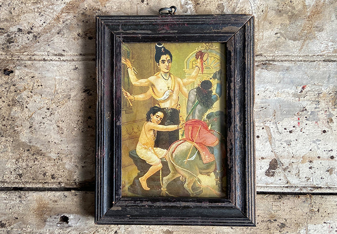 the child Marthanda at the feet of Lord Shiva seeking protection from Lord Yama, god of destruction/death.