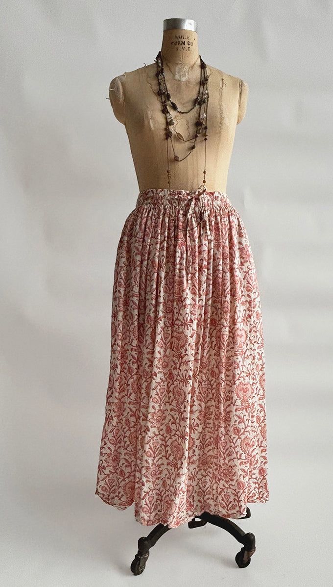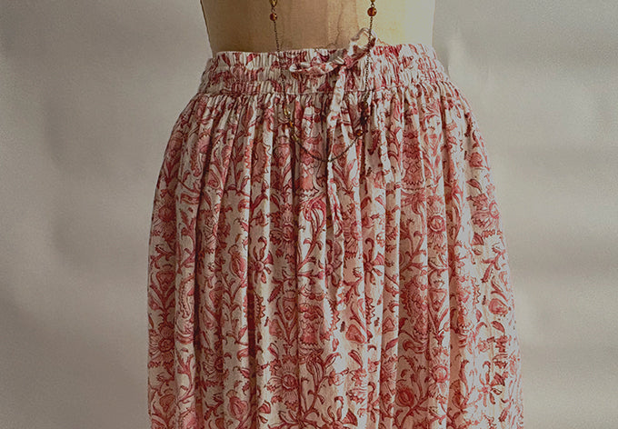 double elastic waist with adjustable drawsting, raw edge hem, on seam pockets, mid calf length