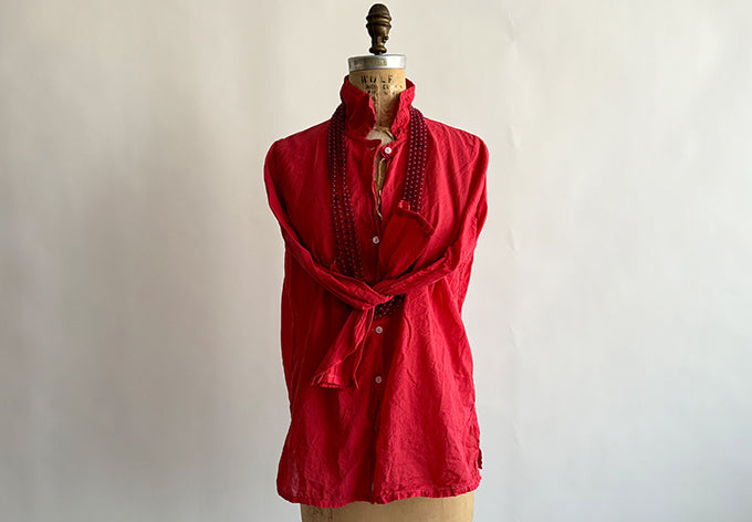 classic cut shirt is hand dyed and has silver zari topstitching, mother of pearl buttons