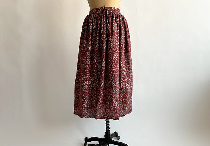 double elastic waist with adjustable drawsting, raw edge hem, on seam pockets, mid calf length